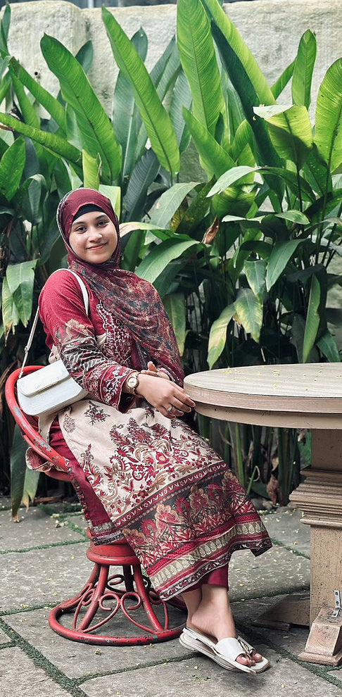 Elevate your everyday style with this beautifully crafted stitched Pakistani suit. Designed in a rich maroon–beige palette, the outfit features detailed print work and subtle embroidery that adds a touch of elegance. The cotton top and bottom ensure all-day comfort, while the soft printed dupatta completes the look with effortless grace.